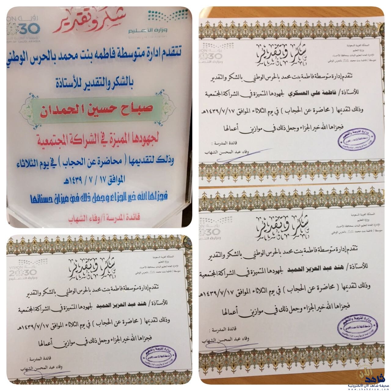 اقامت متوسطة فاطمة بنت محمد بالحرس الوطني يوم الثلاثاءبرنامج بعنوان حجابي نجاتي في الشراكة المجتمعية تقديم الأستاذة صباح الحمدان الأستاذة فاطمة العسكري الأستاذة هند الحميد تحت إشراف مشرفتا النشاط الأستاذة حنان الفهيد الأستاذة حصه العمي وحضر البرنامج منسوبات المدرسة من معلمات وطالبات وعلى رأسهم قائدة المدرسة الأستاذة وفاء الشهاب وتم تقديم درع وشهادة شكر للداعيات على المحاضرة وشكرت قائدة المدرسة الجميع على الحضور