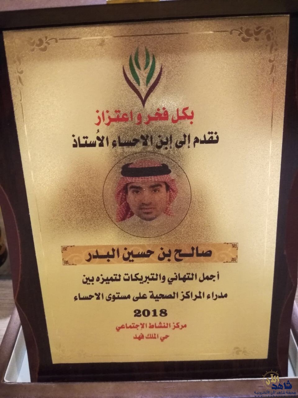 كما تم في الحفل تكريم الأستاذ صالح البدر ( مدير مركز شعبة المبرز للصحة العامة ) والذي حصل على درع التميز لحصول المركز على اعتماد المركز السعودي لاعتماد المنشئات الصحية ، ودرع التميز للدورة التدريبية لمدراء المراكز الصحية .