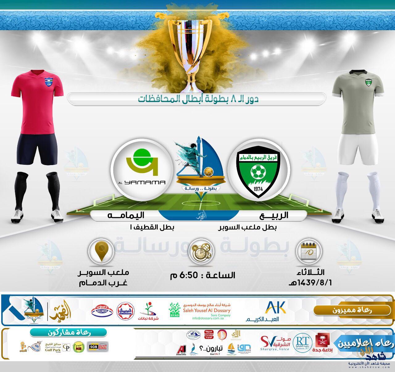 حيث يلتقى في المواجهة الأولى فريقي الربيع (بطل ملعب السوبر غرب الدمام) والبدر(شركة اليمامة) بطل بطولة الجراري بالقطيف ..