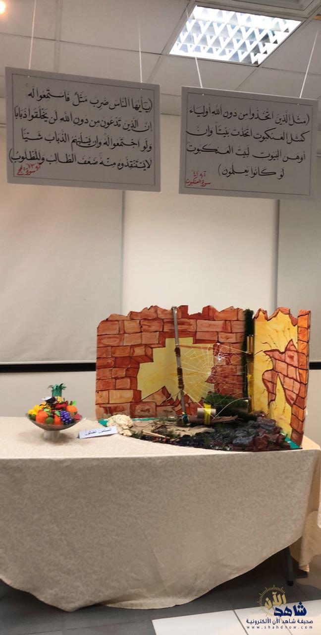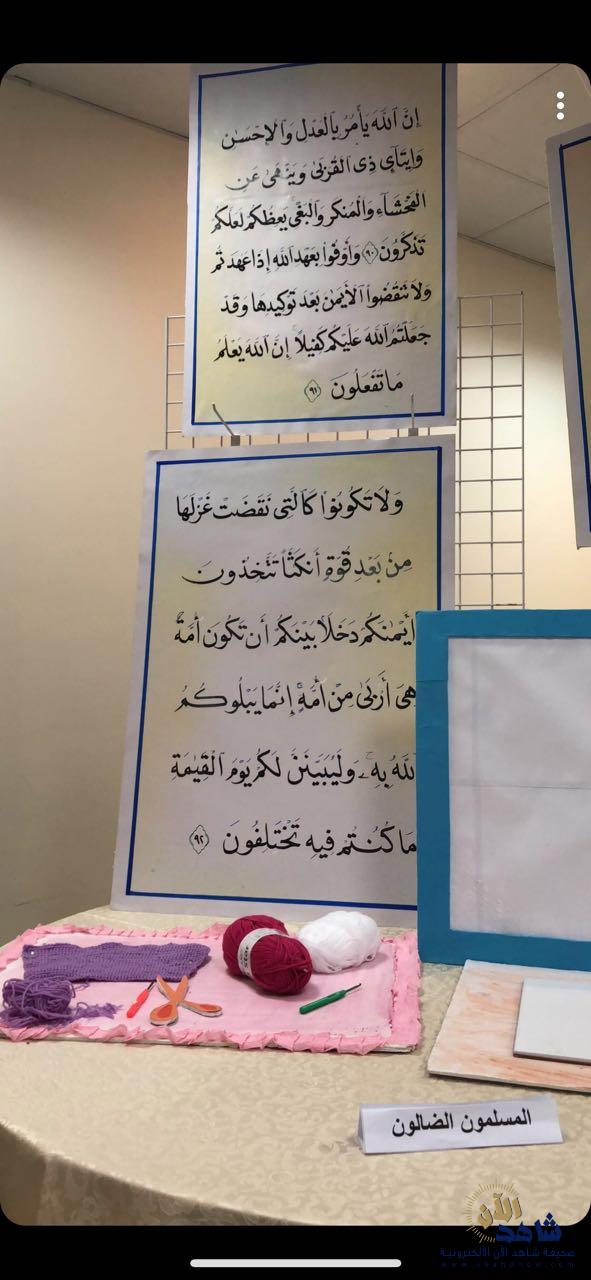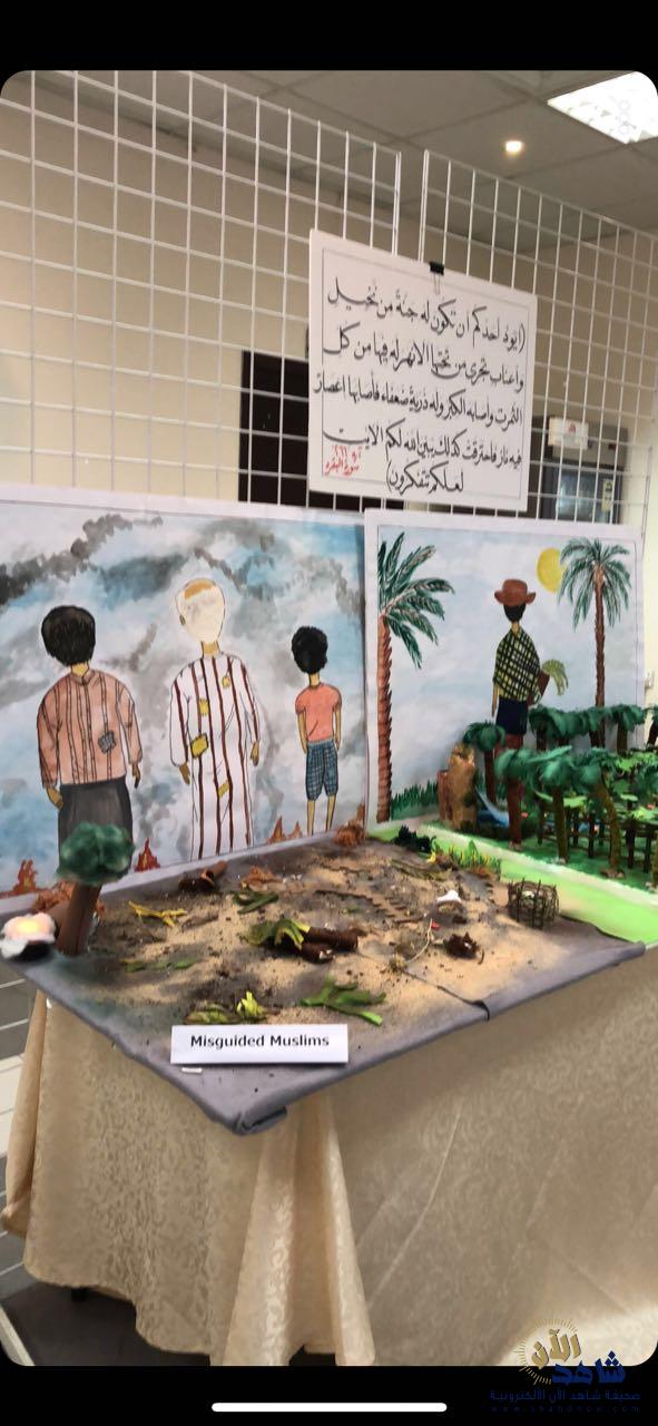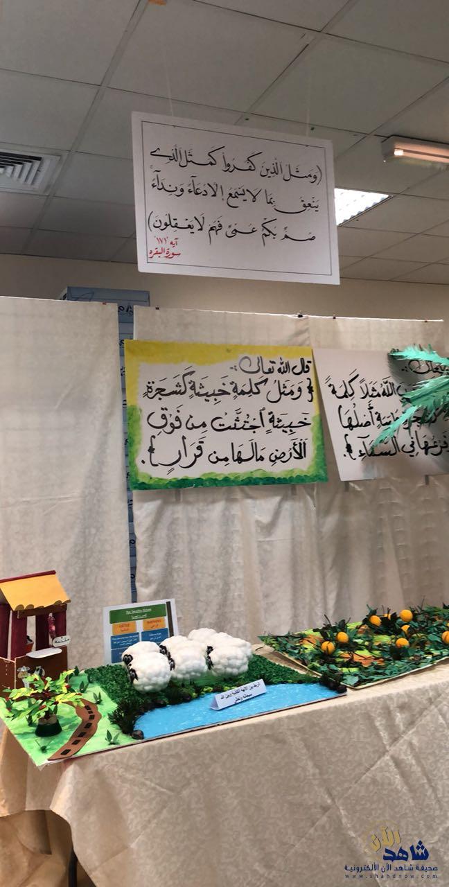 المعرض يدعم اللغتين العربية والانجليزية وتقدمت الاستاذة/ نيرة بشرح وتحدث باللغة الانجليزية للزائرات المعرض وتفسير الايات من خلال المجسمات المعروضة وضع عبارات باللغتين للزائرات تترجم العرض الخاص .