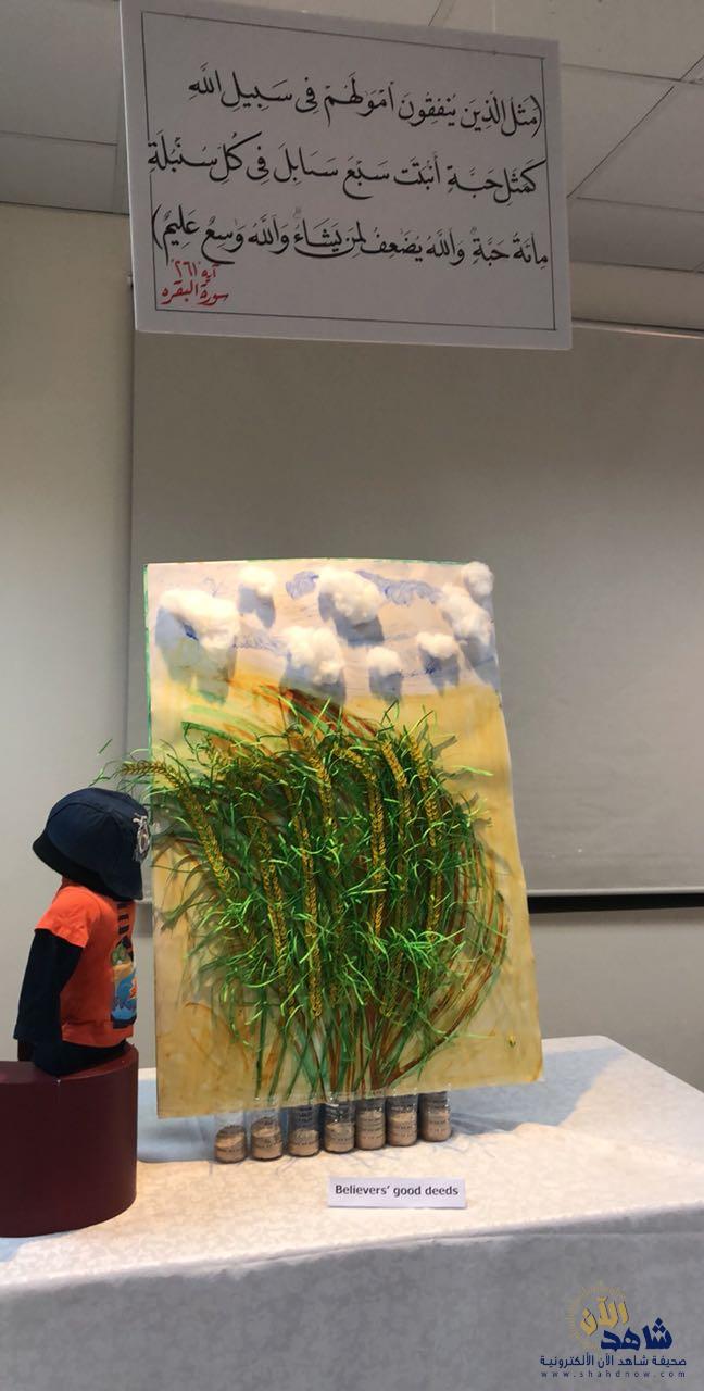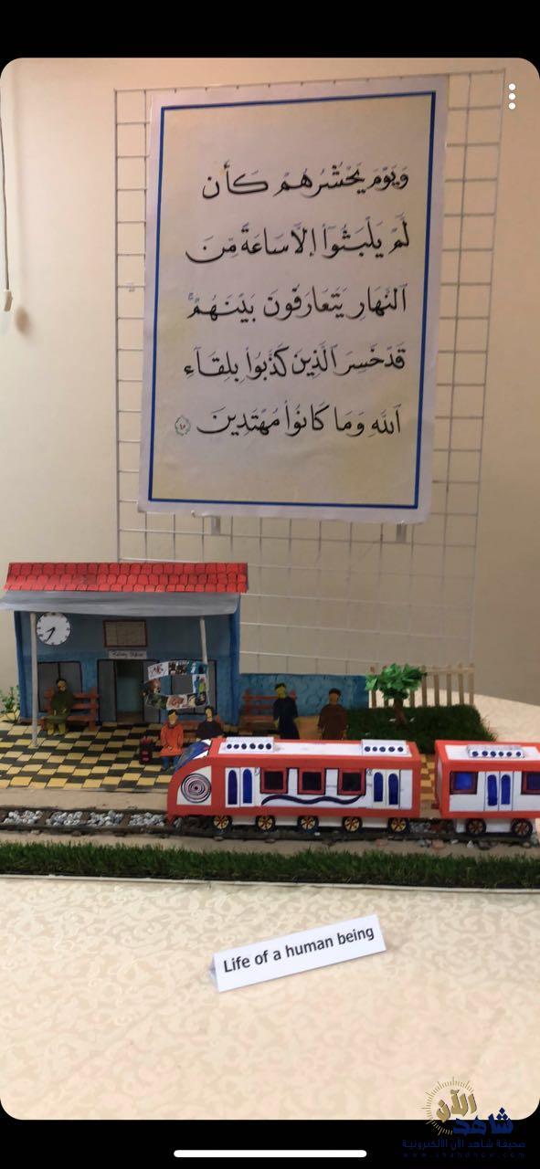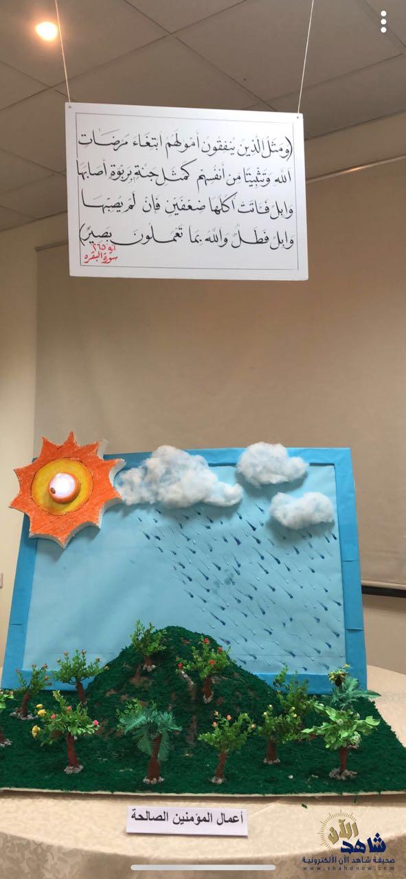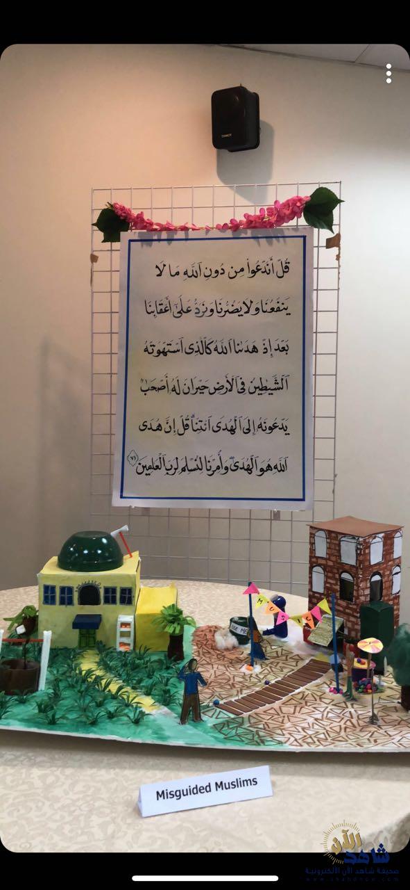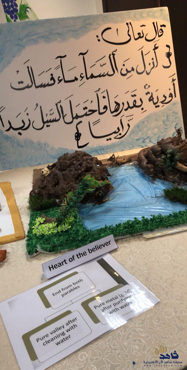 المعرض يدعم اللغتين العربية والانجليزية وتقدمت الاستاذة/ نيرة بشرح وتحدث باللغة الانجليزية للزائرات المعرض وتفسير الايات من خلال المجسمات المعروضة وضع عبارات باللغتين للزائرات تترجم العرض الخاص .