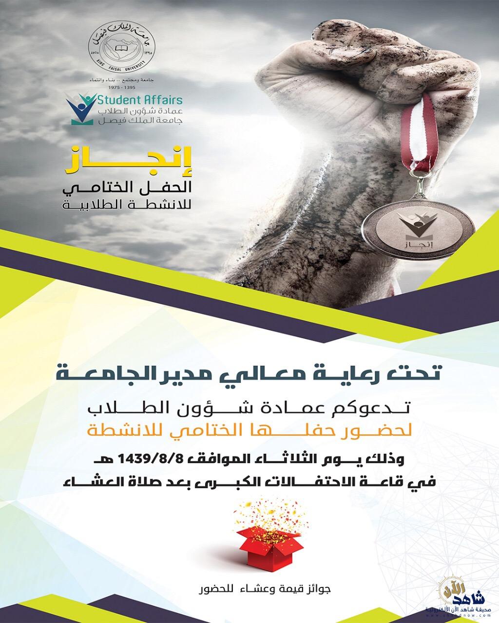 برعاية معالي مدير جامعة الملك فيصل الدكتور محمد بن عبد العزيز العوهلي تنظم عمادة شؤون الطلاب الحفل الختامي للأنشطة الطلابية وذلك اليوم الثلاثاء الساعة السابعة والنصف مساءً في قاعة الاحتفالات الكبرى بالمدينة الجامعية.