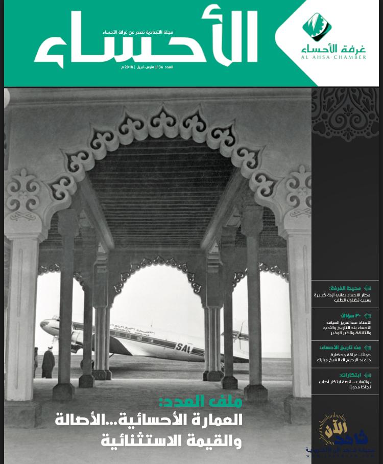 في ثوب جديد يحتفي باستضافة أقلام جديدة وإبداعات متنوّعة بنكهة “أحسائية”، أصدرت غرفة الأحساء قبل أيام، عددًا جديدًا من مجلتها(الأحساء)، حفل بمواد ومقالات وموضوعات متجددة وثرية، تصدرها ملف العدد حول “العمارة الأحسائية .. الأصالة والقيمة الاستثنائية”، والذي تتبّع التشكيّل الحضري لمدن ومجتمعات الأحساء، مستعرضًا نماذج من مفردات العمارة الأحسائية ومتتماتها، مؤكدًا أن إيجاد حلول حضرية وعمرانية توائم متطلبات “عصرنة” الحياة، يجب ألا تقود إلى انهيار القيم العمرانية الأحسائية، لكونها جزءً أصيلًا من الهوية الثقافة المادية لمجتمعات المنطقة عبر التاريخ.