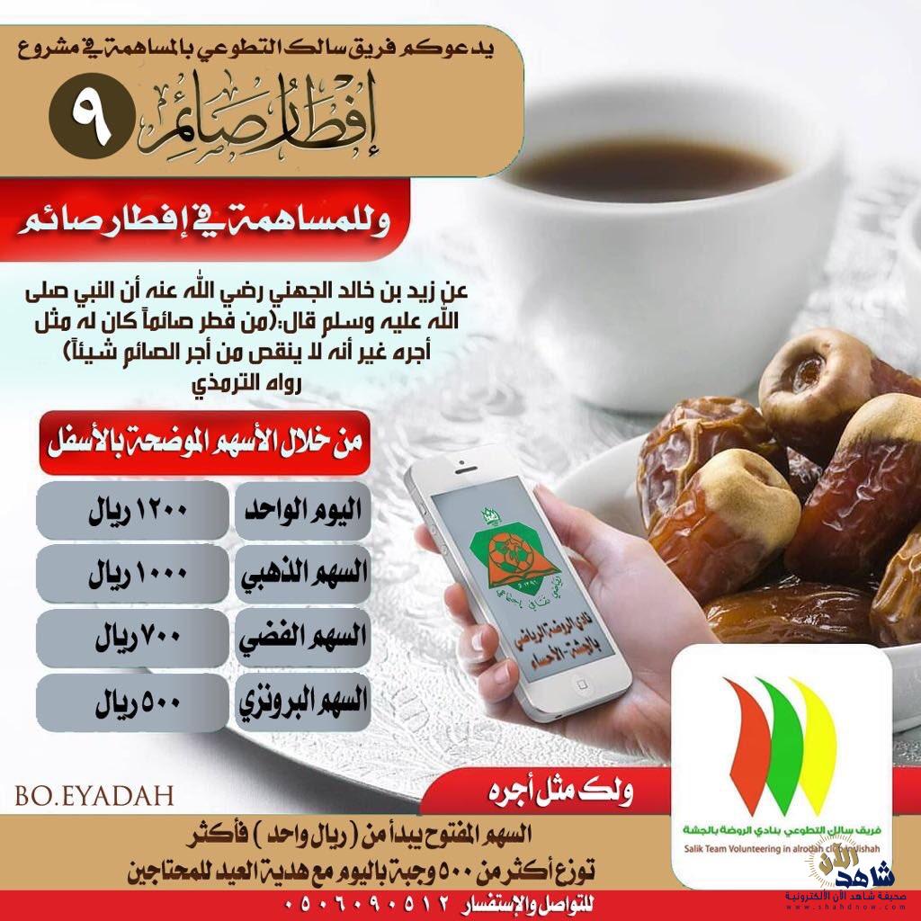 بشراكة مجتمعية مع جمعية البر بالأحساء لتفعيل برنامج ” تركد ٢ ” أنهى فريق سالك التطوعي بنادي الروضة بمدينة الجشة بمحافظة الأحساء ، كافة استعداداته لتنفيذ برنامجه السنوي ” إفطار صائم الجوالة ( 9 ) , الذي ينفذه الفريق خلال شهر رمضان المبارك القادم .