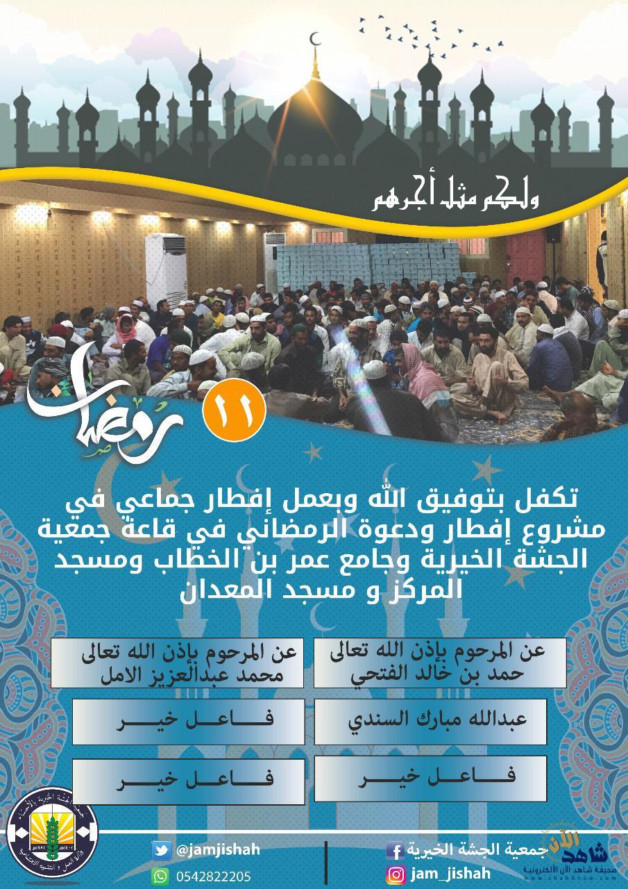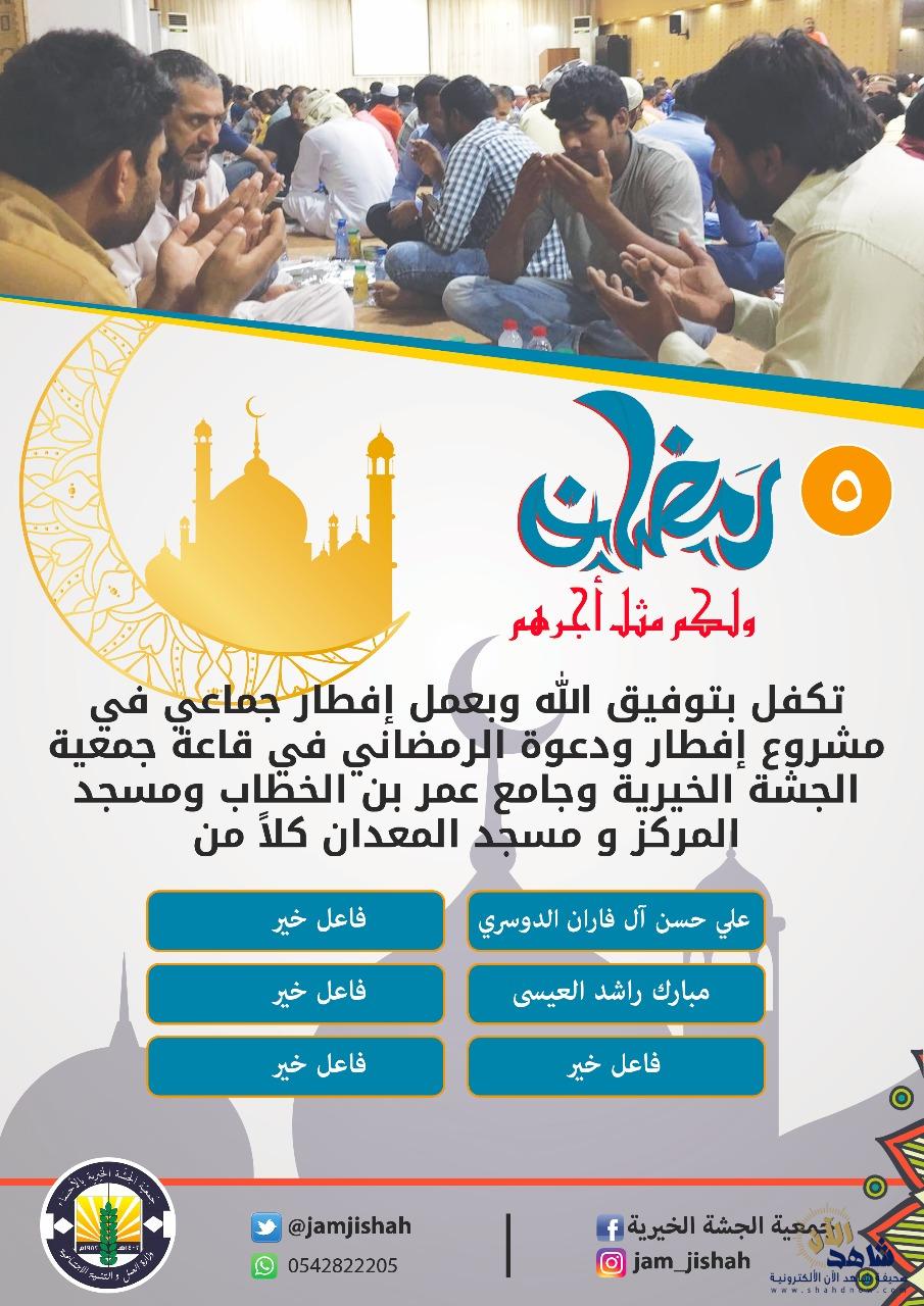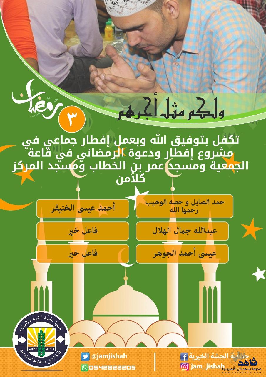 ولكم مثل أجرهم : تكفل بتوفيق الله وبعمل إفطار جماعي في مشروع إفطار ودعوة الرمضاني في قاعة جمعية الجشة الخيرية وجامع عمر بن الخطاب ومسجد المركز كلاً من حمد الصايل و حصة الوهيب رحمهما الله ، أحمد عيسى الخنيفر ، عبدالله جمال الهلال ، فاعل خير ، عيسى أحمد الجوهر ، فاعل خير .