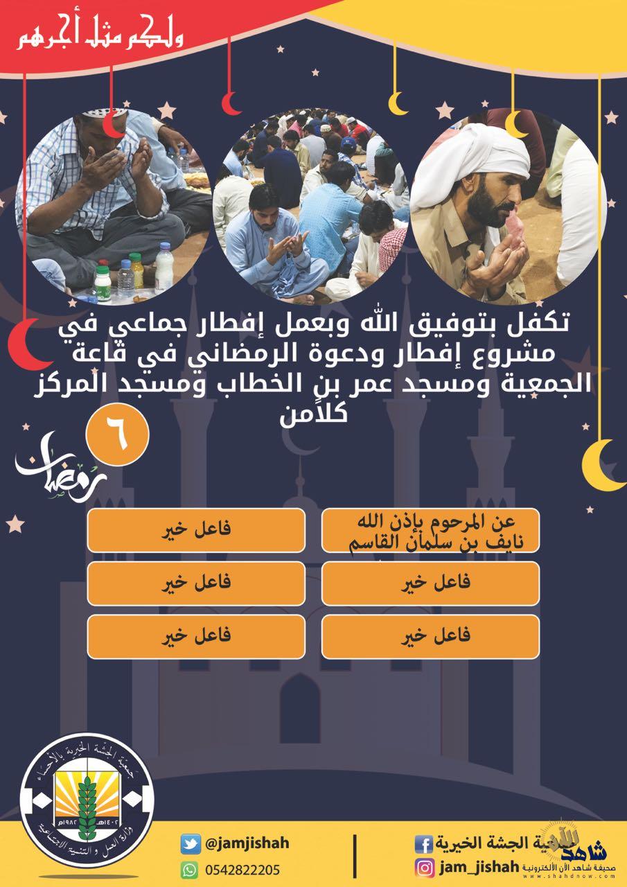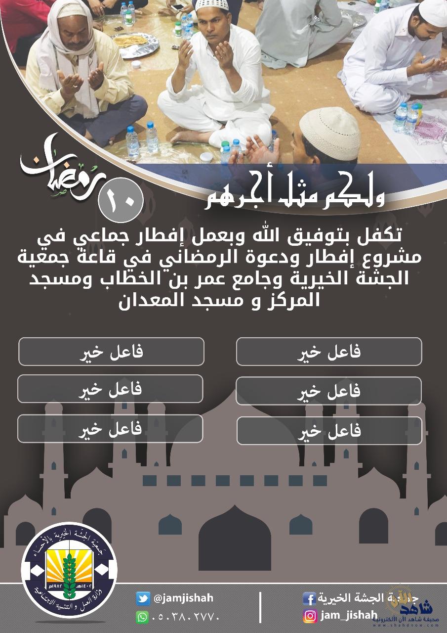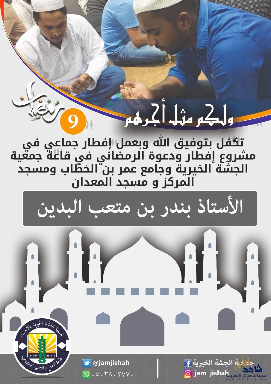 ولكم مثل أجرهم : تكفل بتوفيق الله وبعمل إفطار جماعي في مشروع إفطار ودعوة الرمضاني في قاعة جمعية الجشة الخيرية وجامع عمر بن الخطاب ومسجد المركز كلاً من حمد الصايل و حصة الوهيب رحمهما الله ، أحمد عيسى الخنيفر ، عبدالله جمال الهلال ، فاعل خير ، عيسى أحمد الجوهر ، فاعل خير .