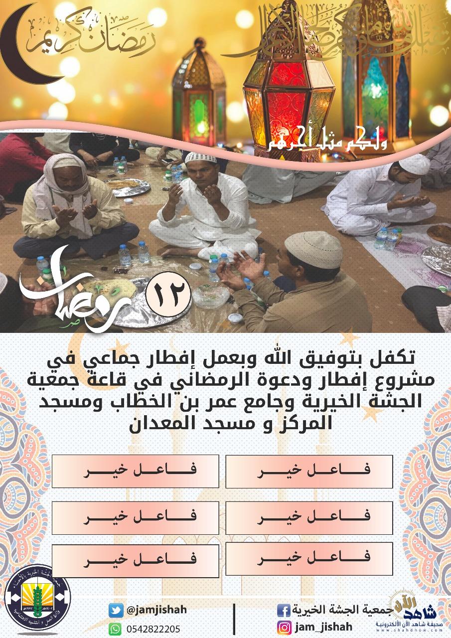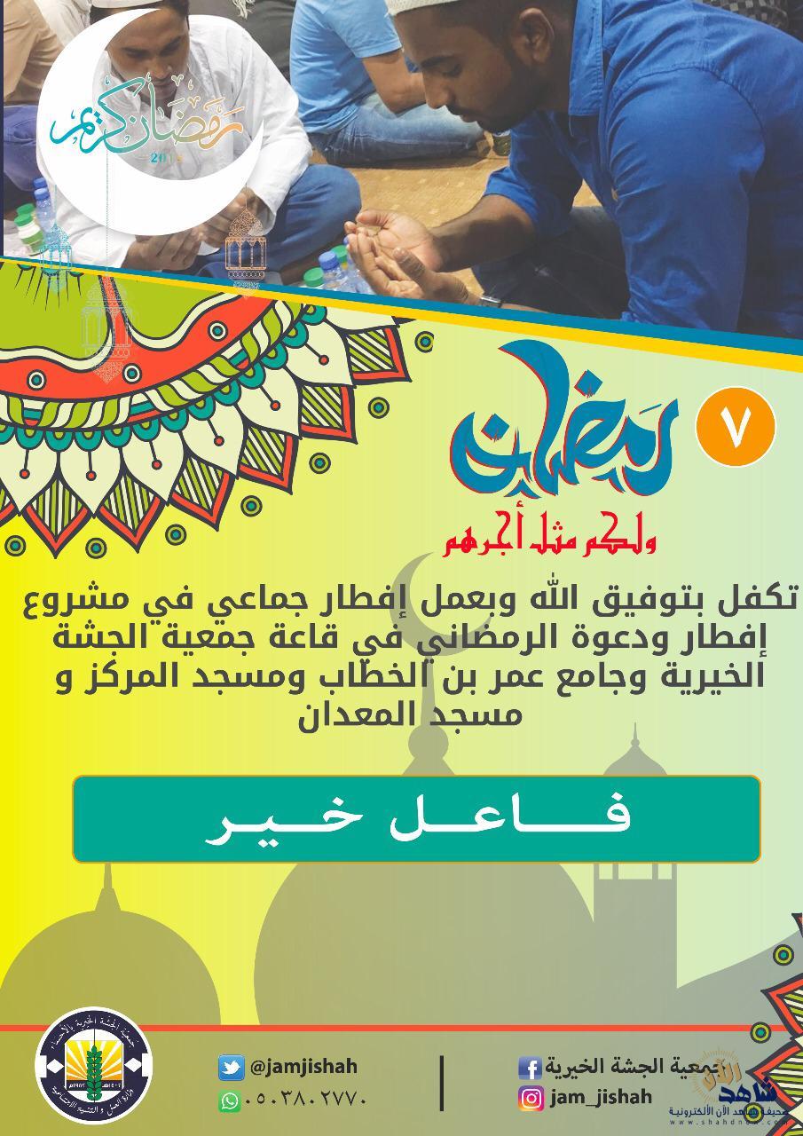ولكم مثل أجرهم : تكفل بتوفيق الله وبعمل إفطار جماعي في مشروع إفطار ودعوة الرمضاني في قاعة جمعية الجشة الخيرية وجامع عمر بن الخطاب ومسجد المعدان ومسجد المركز (فاعل خير) .