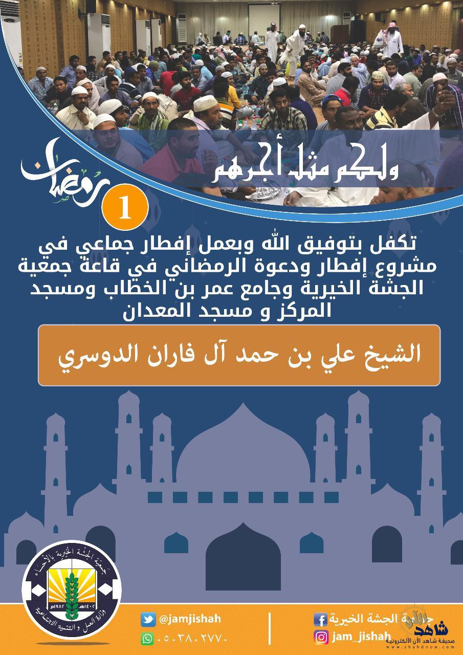 ولكم مثل أجرهم : تكفل بتوفيق الله وبعمل إفطار جماعي في مشروع إفطار ودعوة الرمضاني في قاعة جمعية الجشة الخيرية وجامع عمر بن الخطاب ومسجد المعدان الشيخ علي بن حمد آل فاران الدوسري .