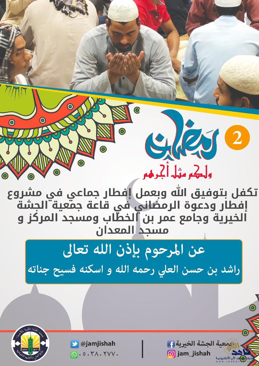 ولكم مثل أجرهم : تكفل بتوفيق الله وبعمل إفطار جماعي في مشروع إفطار ودعوة الرمضاني في قاعة جمعية الجشة الخيرية وجامع عمر بن الخطاب ومسجد المعدان عن المرحوم بإذن الله تعالى راشد بن حسن العلي رحمه الله واسكنه فسيح جناته .