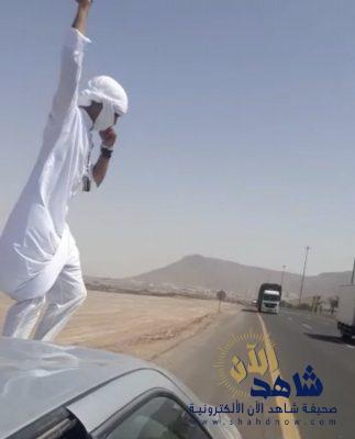 وفي وقت سابق، قفز الشاب المتهور من فوق سيارته ليقف أمام شاحنة في مشهد أثار الغضب؛ بسبب تهوره.