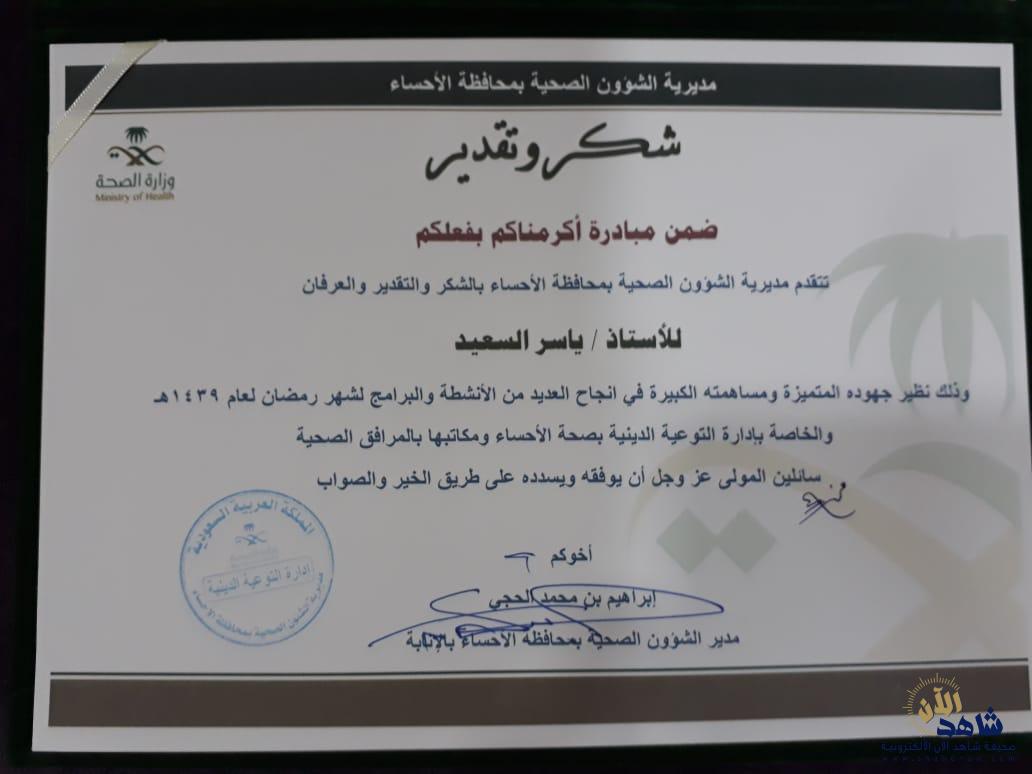 ومن جانب آخر اعبر الاستاذ ياسر محمد السعيد عن شكره وتقديره الى صحة الاحساء على هذا المبادرة وتكريمه . كما اوضح انه دافع لنا لبذل مزيد من الجهد والعمل في سبيل تحقيق الأهداف المرجوة والتى تصب في صالح المريض والمراجع .
