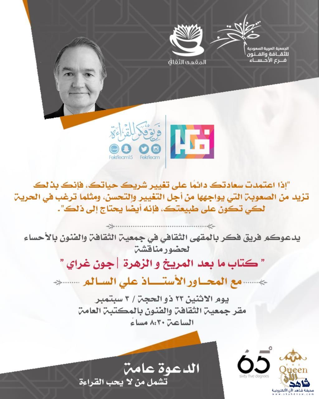 يعود فريق فكر للقراءة بالمقهى الثقافي بجمعية الثقافة والفنون بالأحساء في تقديم الحلقات التي تحمل عناوين مختلفة ومناقشات تثري الجانب الثقافي والمعرفي حيث يعود إلى الكتب في مناقشة جديدة ومثرية لكتاب (ما بعد المريخ والزهرة) للكاتب جون غراي مؤلف كتاب الرجال من المريخ والنساء من الزهرة والذي تصدر قائمة الكتب الأكثر مبيعًا في العالم ، وذلك يوم الإثنين القادم ٢٣ ذي الحجة ١٤٣٩ بمقر الجمعية بالمكتبة العامة ، ويدير الحوار الأستاذ علي السالم وذلك بطرح مجموعة من التساؤلات حول طبيعة العلاقات بين النساء والرجال وطبيعة الاختلاف الفطري بينهم في لقاء مفتوح للحضور ويتم فيه تبادل الآراء المختلفة
