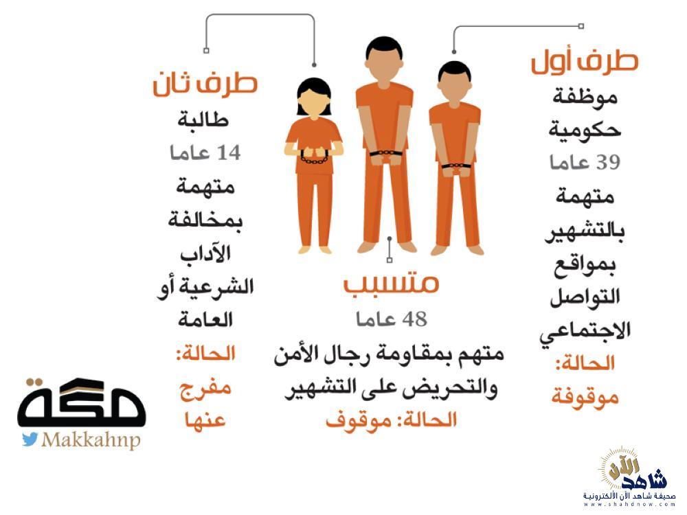 وخلصت تحقيقات النيابة العامة لاتهام المتهم الأول بعدم الامتثال لرجل الأمن، والتشكيك في ولائه لولي الأمر وتهديده، والتحريض على التصوير والنشر عبر مواقع التواصل الاجتماعي، واتهام المرأة بإنتاج ما من شأنه المساس بالآداب العامة، وذلك بتصوير رجل الأمن أثناء أداء مهام عمله، والإرسال عبر مواقع التواصل الاجتماعي، في حين اتهمت الفتاة بتصوير رجل الأمن أثناء عمله والتلفظ عليه.