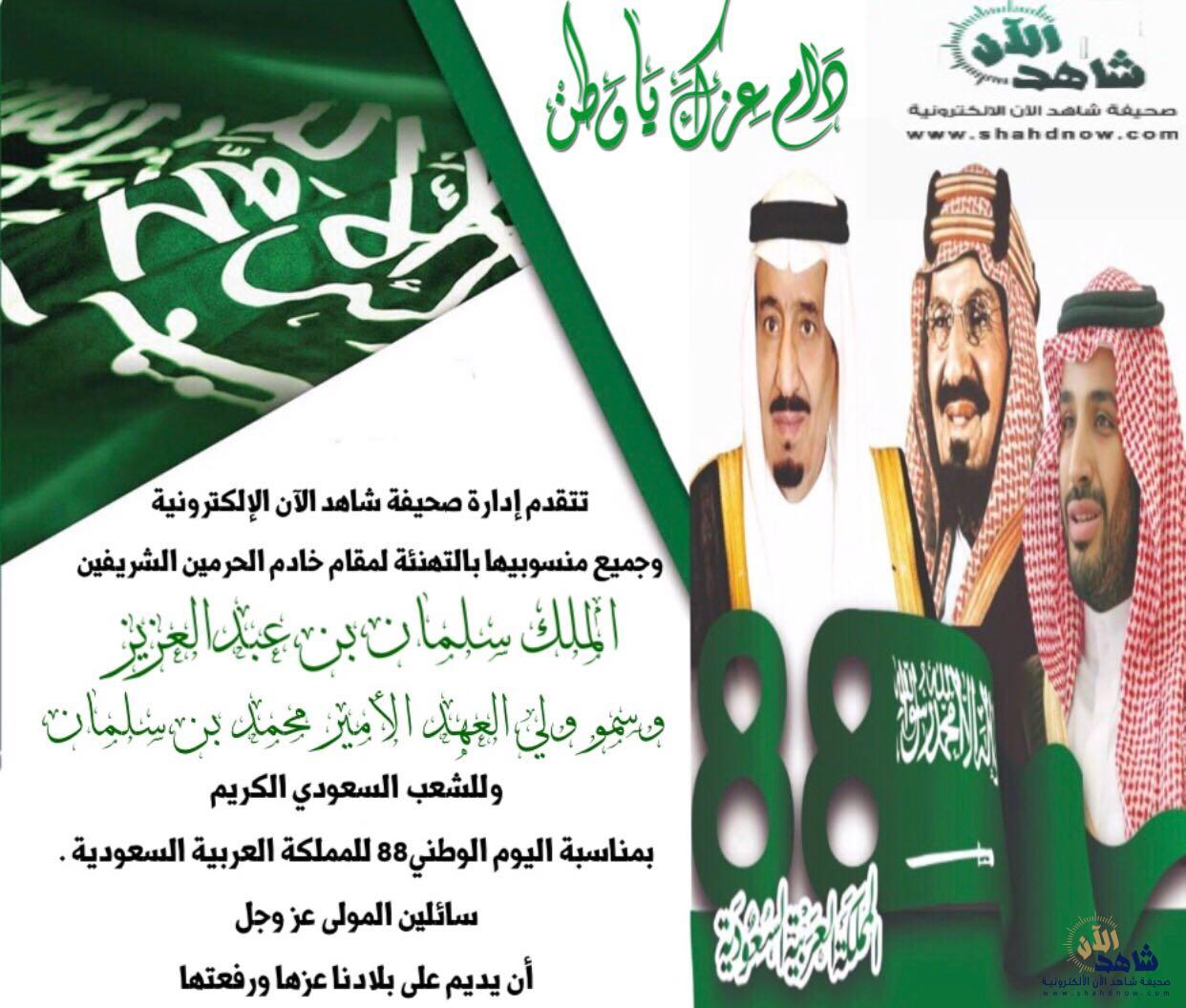 يتقدم مجلس إدارة صحيفة شاهد الآن الإلكترونية وجميع منسوبيها بالتهنئة لمقام خادم الحرمين الشريفين الملك سلمان بن عبدالعزيز آل سعود وسمو ولي العهد صاحب السمو الملكي الأمير محمد بن سلمان بن عبدالعزيز آل سعود – “حفظهم الله” – وللشعب السعودي الكريم بمناسبة اليوم الوطني88 للمملكة العربية السعودية .