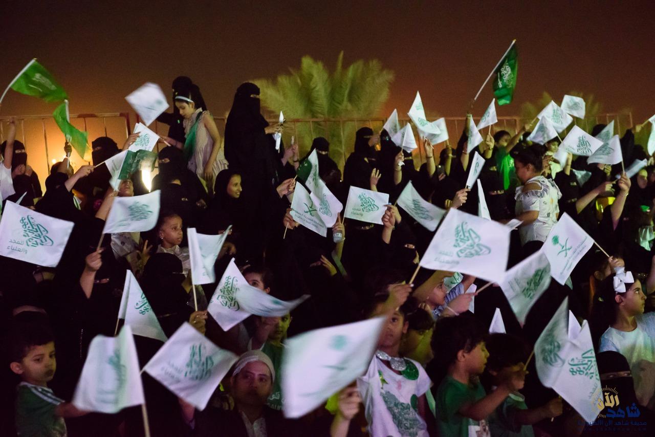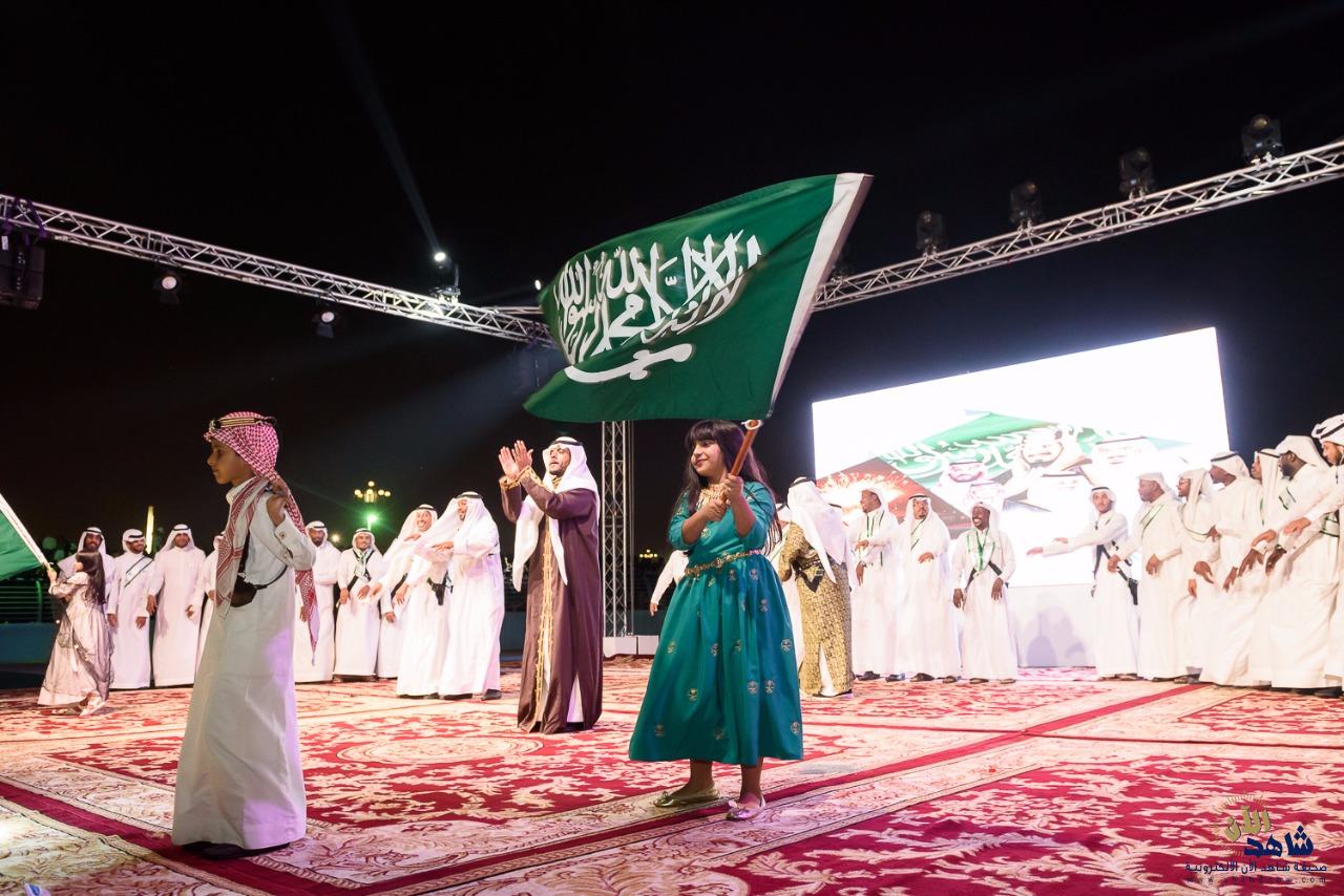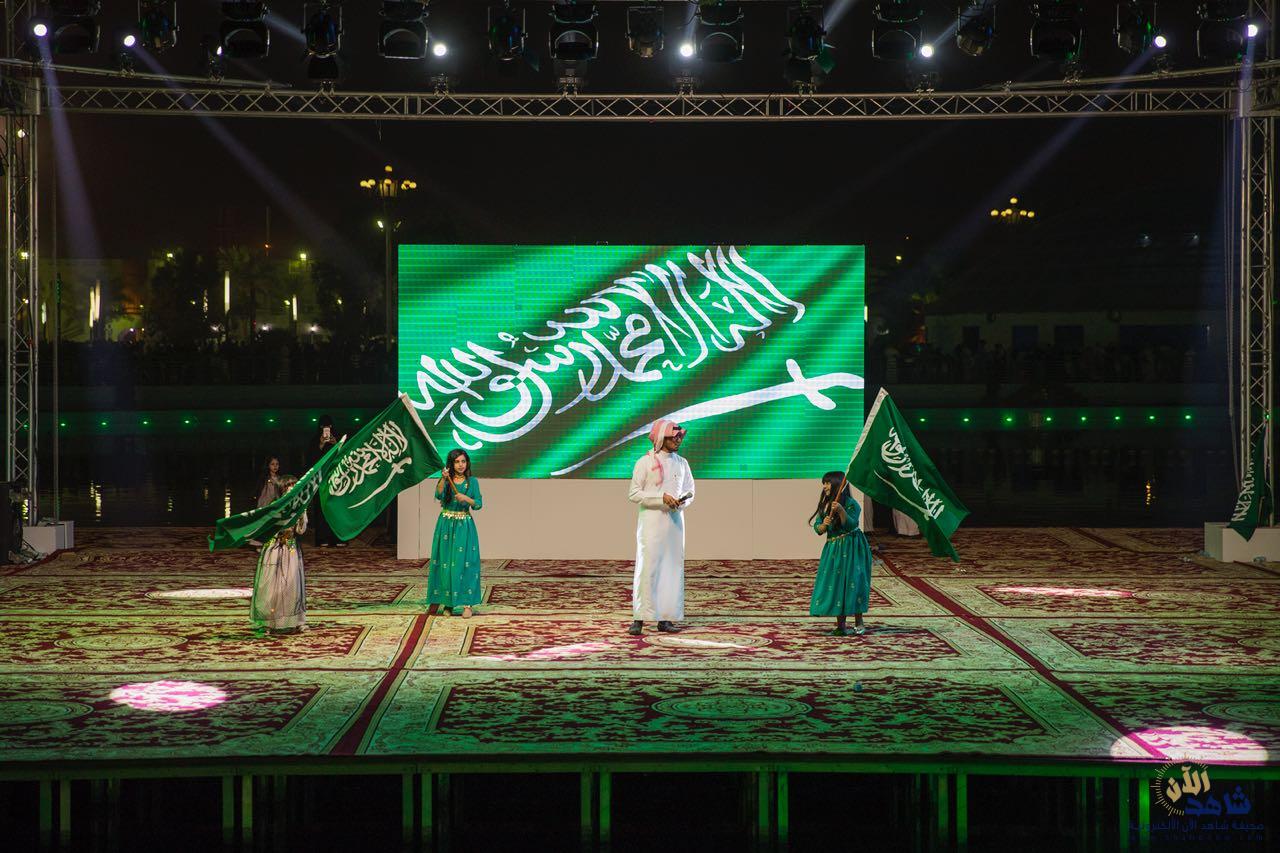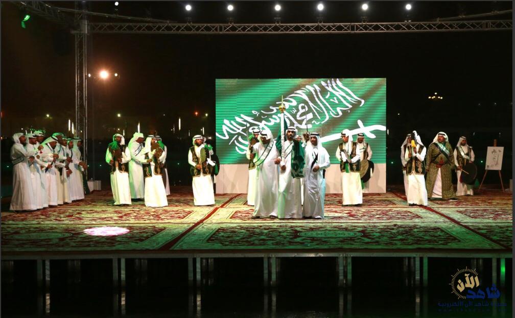 بعد ذلك، قدمت فرقة الفنون الشعبية عروض العرضة السعودية، وسط دوي أصوات الطبول وتراقص السيوف مرددين أهازيج النصر والفخر “سيدي سمعاً وطاعة”، رافعين راية العلم السعودي خفاقاً وسط المسرح المائي في المنتزه.