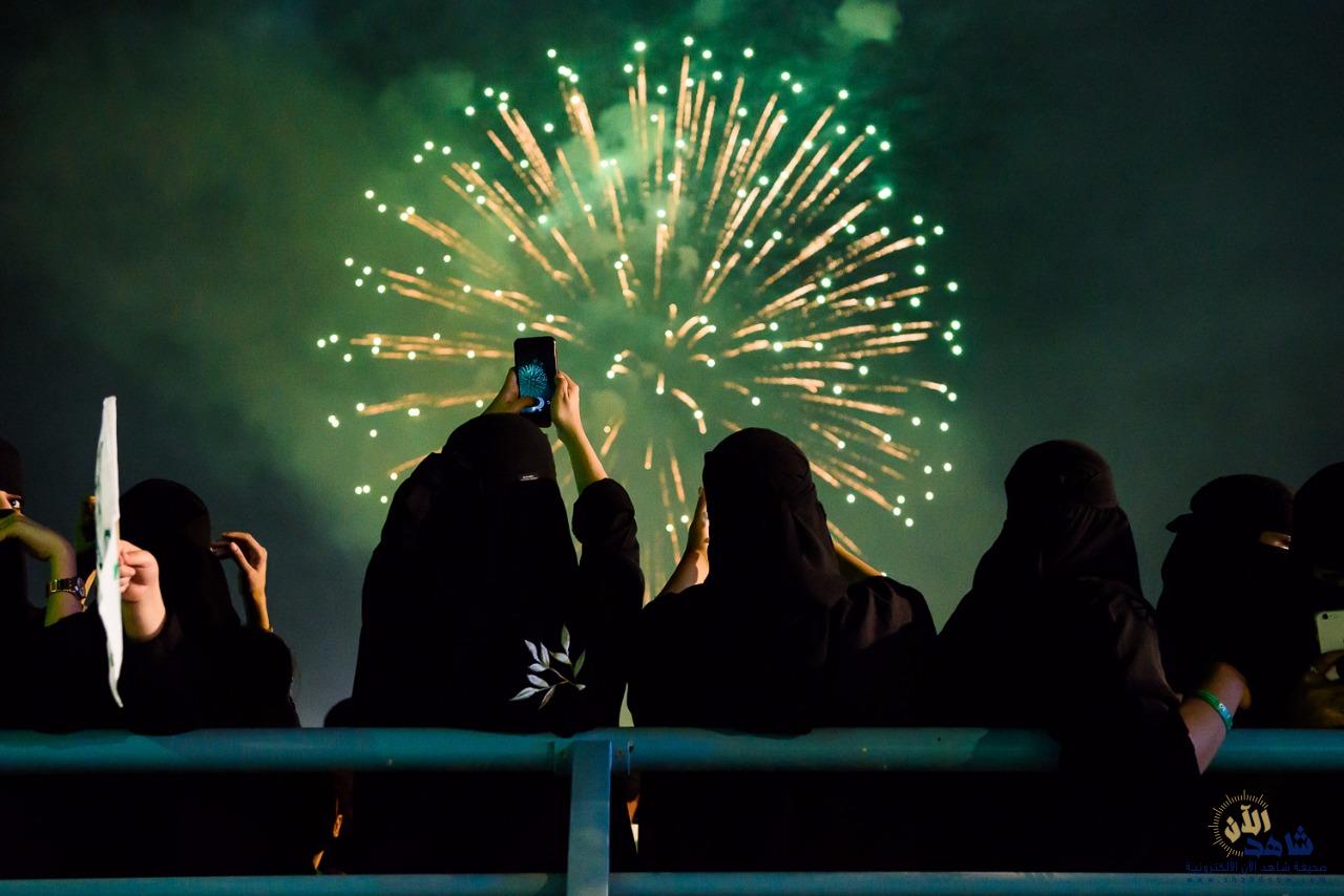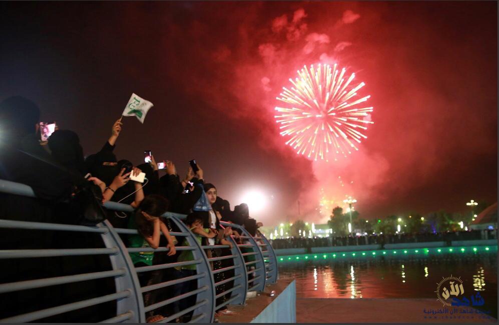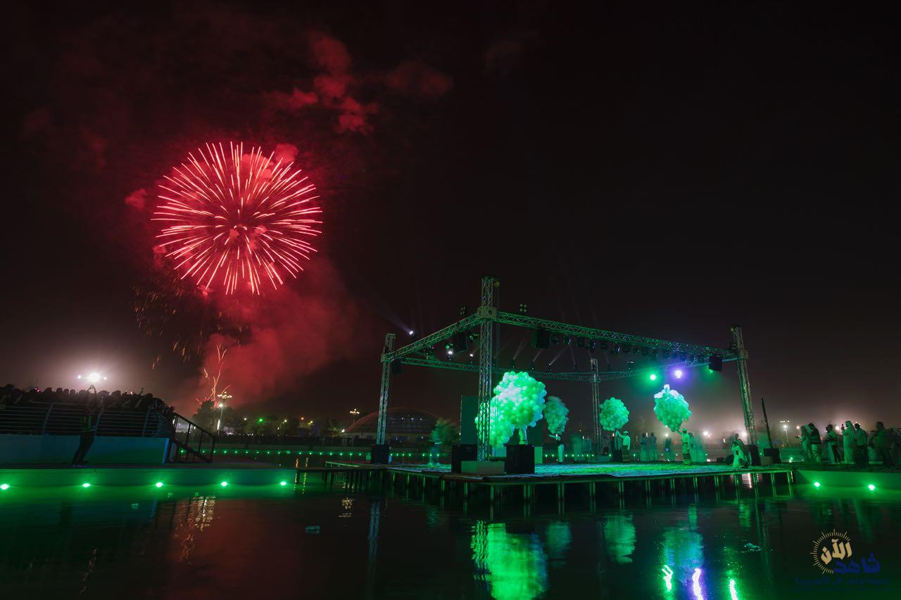 وفي الساعة العاشرة، وتزامناً مع مناطق المملكة، وبوسط منتزه الملك عبدالله البيئي، انطلقت الهيئة العامة للترفيه الألعاب النارية لتلون سماء الأحساء بالأضواء المتلألئة في عرض فريد من نوعه.