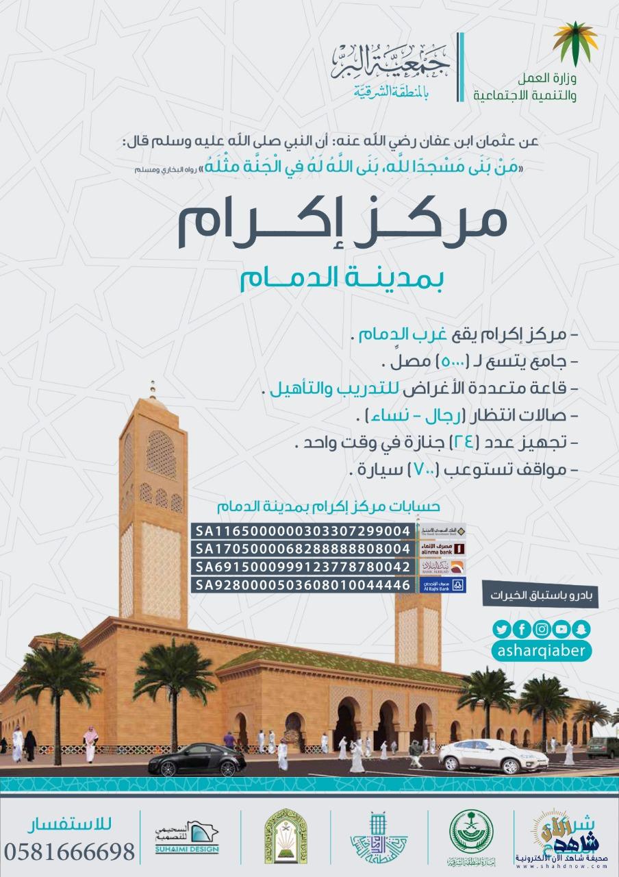 أطلقت جمعية البر بالمنطقة الشرقية حملة التبرع لبناء جامع يتسع لـ 5000 مصل تحت مسمى “مركز إكرام ” بالدمام وقال الأمين العام لجمعية البر بالمنطقة الشرقية سمير بن عبد العزيز العفيصان أن المركز سيضم جامعا يتسع ل5000مصل في وقت واحد كما يحتوي المشروع على مغسلة للموتى تستوعب 24 جنازة في وقت واحد ويضم مواقف تستوعب 700 سيارة وأوضح العفيصان أن المركز سيتم بنائه على مساحة 60 ألف متر مربع بالقرب من المقبرة الحالية بغرب الدمام ليكون داخل حدود التوسع العمراني المستقبلي لمدينة الدمام وعلى مقربة من طريق الملك فهد وطريق مجلس التعاون “أبو حدرية” وأضاف العفيصان أن مركز إكرام بمدينة الدمام كان قد دشن البدء في تنفيذه صاحب السمو الملكي أمير المنطقة الشرقية ورئيس مجلس إدارة جمعية البر بالشرقية أثناء رئاسة سموه للجمعية العمومية 41 لبر الشرقية