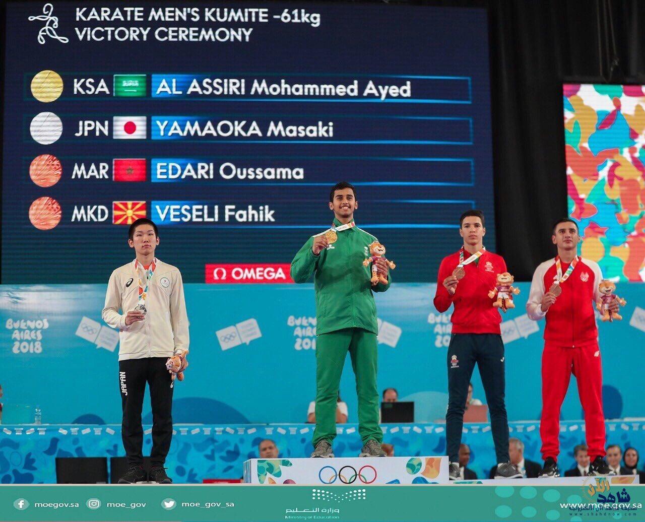 هنأ مدير عام التعليم بالمنطقة الشرقية الدكتور ناصر بن عبد العزيز الشلعان اللاعب السعودي للكاراتيه محمد بن عائض محمد آل سلطان العسيري الطالب الذي يدرس بمدرسة الملك فهد الثانوية بالجبيل ، بعد تحقيقه للمرة الأولى في تاريخ المملكة الميدالية الذهبية لمنافسات وزن 61 كيلوغراماً، ضمن دورة الألعاب الأولمبية الثالثة للشباب بالأرجنتين “بيونيس آيرس” 2018 وذلك خلال مشاركته في المحفل الأولمبي من بين آلاف اللاعبين وعدد من الدول .