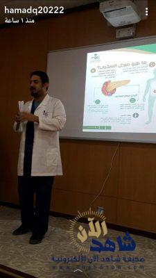 حيث بدات الفعالية محاضرات علمية تثقيفية بدا في الاخصائية ليلى الحسيني مسؤولة التوعية الصحية بمقطتطفات سريعة ومعلومات عن سبب اختيار هذا اليوم وعن سبب اختيار شعاره وان فردريك بنتنغ الذى ولد في 14 نوفنبر هو مكتشف الانسولين . كما ذكرت ان المملكة تحتل في مراكز متقدمة بكثرة الاصابة بداء ااسكرى ومن هذا المنطلق حرصت ادارة المستشفى على نشر الوعي الصحي وتعزيزه وتغير السلوك الخاطئ . كما اوضح الدكتور امين العلي في تعريف عن السكري بشكل جذاب يسهل على المتلقي فهمه حيث عرفه بانه مرض مزمن يصاب به الانسان حين لا يعمل البنكرياس على افراز الانسولين بشكل كلي او انخفاض حساسية الانسجة له او الاثنين معا . كما ذكر وصنف انواعه الثلاث