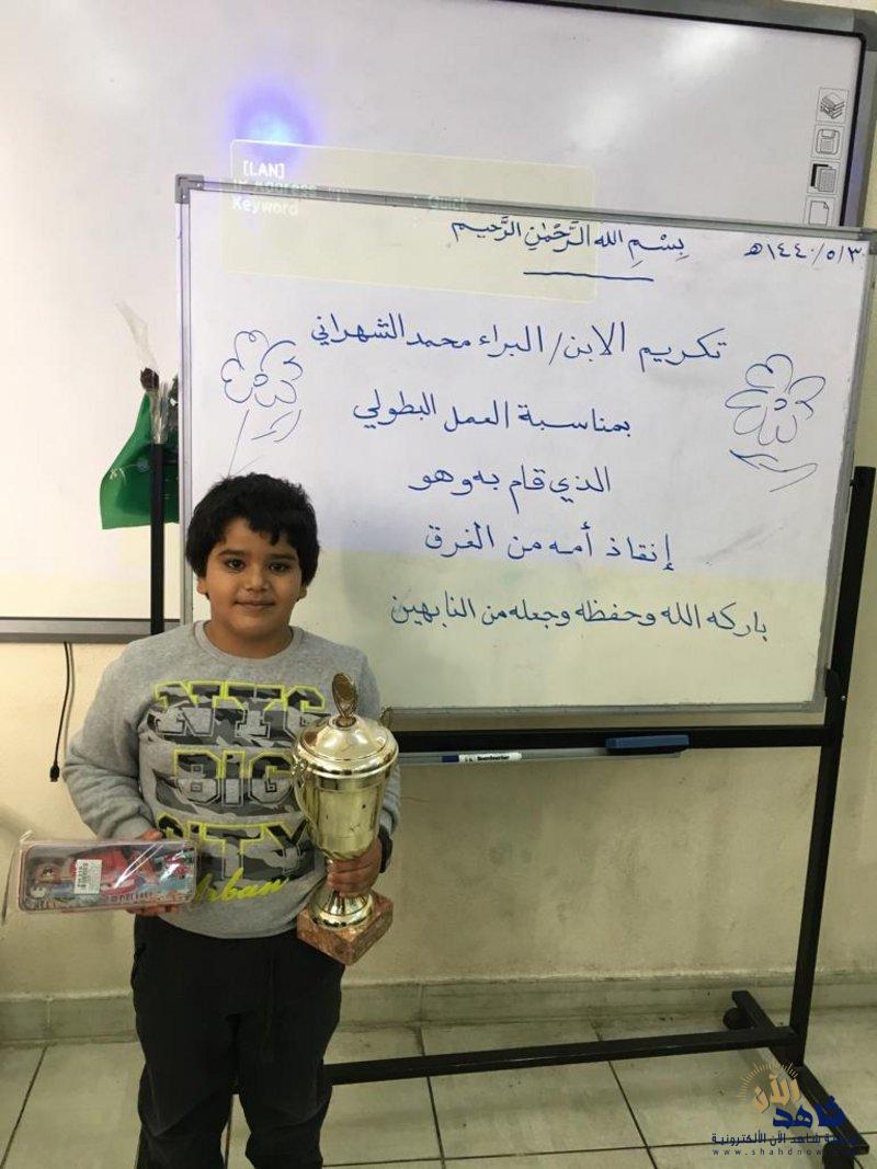 وبهذه المناسبة كرمت مدارس منابع المعرفة الأهلية بشروره الطالب البراء محمد الشهراني الذي يدرس بالصف الثاني الابتدائي لقيامه بهذا العمل البطولي عندما أنقذ والدته من الغرق في اللحظات الأخيرة كونه يجيد السباحة.