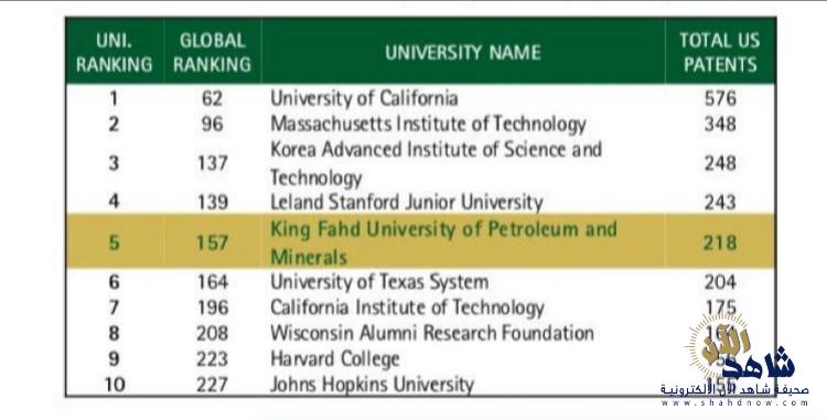 صعدت جامعة الملك فهد للبترول والمعادن إلى المركز الخامس عالميا في أعداد براءات الاختراع بين الجامعات للعام 2018م محققة 218 براءة اختراع مسجلة في مكتب براءات الاختراع الأمريكي. حسب موقع (IF I CLAIMS Patent Services).