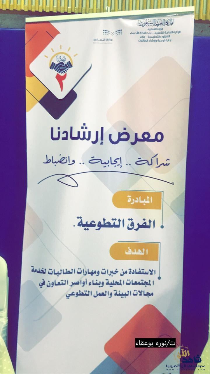 برعاية مدير عام تعليم الأحساء الأستاذ أحمد بن محمد بالغنيم وحضور المساعدة للشؤون التعليمية الأستاذة خلود بنت صالح الكليبي انطلاق معرض وملتقى إرشاد، شراكة إيجابية وانضباط الثاني صباح اليوم الثلاثاء، الذي أقامته إدارة تعليم الأحساء ونظمته إدارة توجيه وإرشاد الطالبات على مسرح المتوسطة الخامسة بالمبرز.