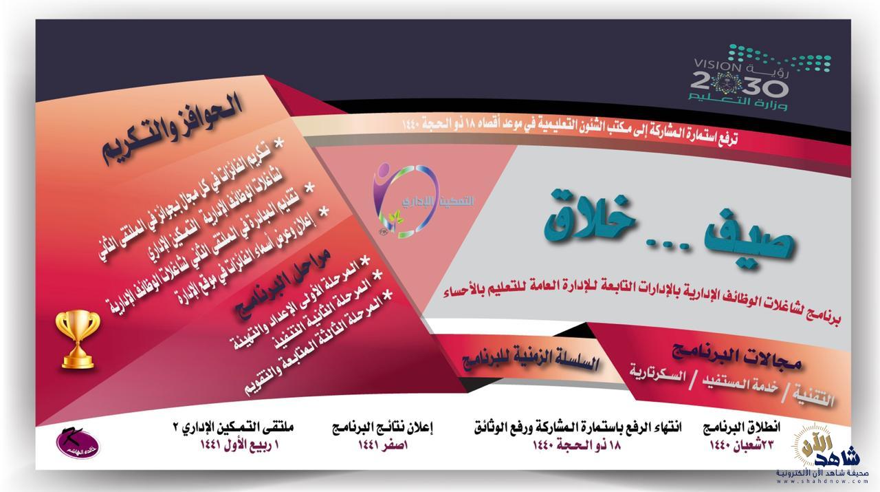 تعتزم الإدارة العامة للتعليم بالأحساء ممثلة بالشؤون التعليمية (بنات) إطلاق برنامج صيف خلّاق لشاغلات الوظائف الإدارية ، يأتي هذا البرنامج من منطلق استثمار طاقات شاغلات الوظائف الإدارية فيما يسهم في تطوير الإجراءات والعمليات المعمول بها في تنفيذ الأعمال الإدارية بتعليم لأحساء ، وقد تبنت الشؤون التعليمية بنات برنامج صيف خلاق والذي يتم من خلاله تحفيز الموظفات ودفعهن لاستغلال فترة العمل في الإجازة الصيفية لتقديم مبادرات في أحد المجالات التالية : التقني ، خدمة المستفيد ، السكرتارية ، وقد أوضح دليل البرنامج وصفا إلى جانب الأهداف والمجالات والحوافز واستمارة المشاركة وقد دعت المساعدة للشؤون التعليمية خلود بنت صالح الكليبي إلى حث منسوبات الإدارة من الإداريات إلى المشاركة في البرنامج الذي يهدف إلى تحسين وتطوير الأداء في الإدارة وتطوير العمليات والإجراءات المعمول بها في تنفيذ الأعمال، مضيفة أن البرنامج يعمل على تحسين وتطوير أداء شاغلات الوظائف الإدارية ودفعهن نحو الإبداع والتميز ، واستثمار طاقات شاغلات الوظائف الإدارية خلال فترة الدوام الصيفي وإشباع حاجاتهن للتقدير ، مشيرة إلى أن برنامج صيف خلاق يتم من خلاله دفع وتحفيز الموظفات الإداريات إلى استغلال فترة العمل الهادئة في الإجازة الصيفية بتبني وطرح مبادرات ومشاريع وإجراءات عمل ومنتجات تقنية.