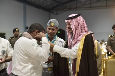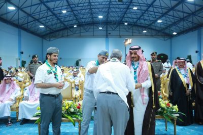 قلد صاحب السمو الأمير عبدالرحمن بن عبدالله بن فيصل محافظ المجمعة ، أربعة من القيادات الكشفية ، منديل الشارة الخشبية ، خلال الحفل الذي اقامته الجمعية مؤخراً في مدينة جلاجل تكريماً للجهات الحكومية والأهلية من شركاء النجاح ، والقطاعات الكشفية المتميزة في البرامج والمشروعات المركزية للجمعية.