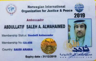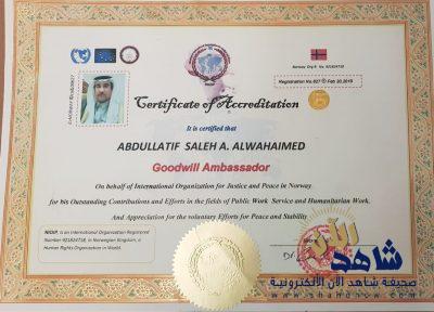 قام صاحب السمو الملكي الأمير سعود بن نايف بن عبدالعزيز آل سعود أمير المنطقة الشرقية بتقليد الأديب عبداللطيف الوحيمد عضو هيئة الصحفيين السعوديين وشاح المنظمة الدولية للعدالة والسلام المعتمدة من هيئة الأمم المتحدة بعد تنصيبه سفيراً لها في العالم وذلك لغزارة كتاباته عن الأحساء ومجتمعها فضلاً عن كتاباته الأدبية والصحفية الكثيرة ومؤلفاته الثقافية وحسابه في تويتر الذي أطلق ١٧ ألف تغريدةٍ حول المحبة والتعايش والتسامح والتصالح والسلام والتفاؤل والأمل والخير والعطاء والنوايا الحسنة وتم إدراج اسمه في لائحة سفراء الإنسانية المعتمدين ومنحه شهادة الاعتماد وبطاقة العضوية في المنظمة التي تمنت له التوفيق والنجاح في جهوده الإنسانية لنشر الخير في كل مكانٍ من خلال حراكه الثقافي والوطني والاجتماعي والإنساني.
