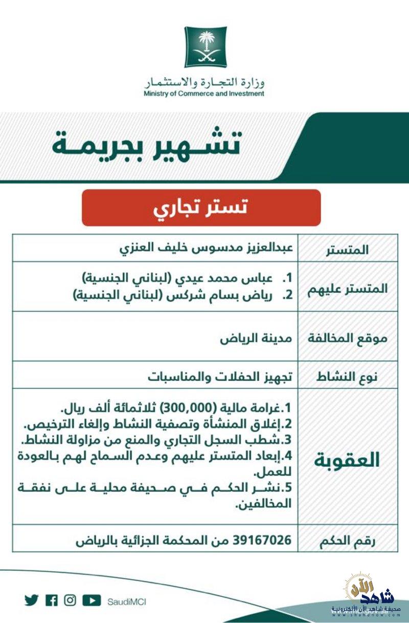 عاقبت وزارة التجارة والاستثمار مواطن ووافدين من الجنسية اللبنانية، بالغرامة والتشهير، وذلك بعد صدور حكم قضائي بإدانتهم بجريمة التستر التجاري وثبوت تورط المواطن في تمكين الوافدين من مزاولة النشاط التجاري باستخدام سجله التجاري والعمل لحسابهم الخاص في نشاط تجهيز الحفلات والمناسبات بمدينة الرياض.