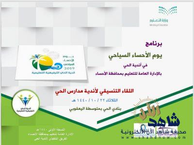 برعاية المدير العام للتعليم والرئيس التنفيذي لأندية الحي وبمتابعة من ممثل الأندية أ. حمد بن محمد العيسى عقد الأجتماع الأول لمنسقي أندية الحي لبرنامج ” يوم الأحساء السياحي ” تحت شعار نادينا واحة سياحية ” يوم أمس الثلاثاء بنادي الحي بمتوسطة اليعقوبي